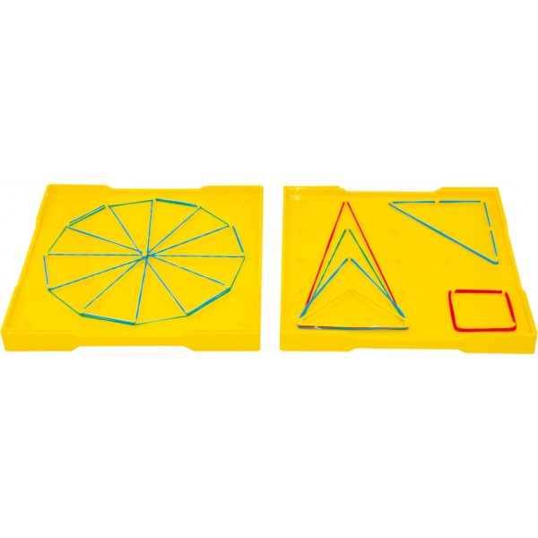 Cara bermain: Merangkai bentuk bangun datar dengan menggunakan karet gelang yang dialaskan pada papan geoboard.
